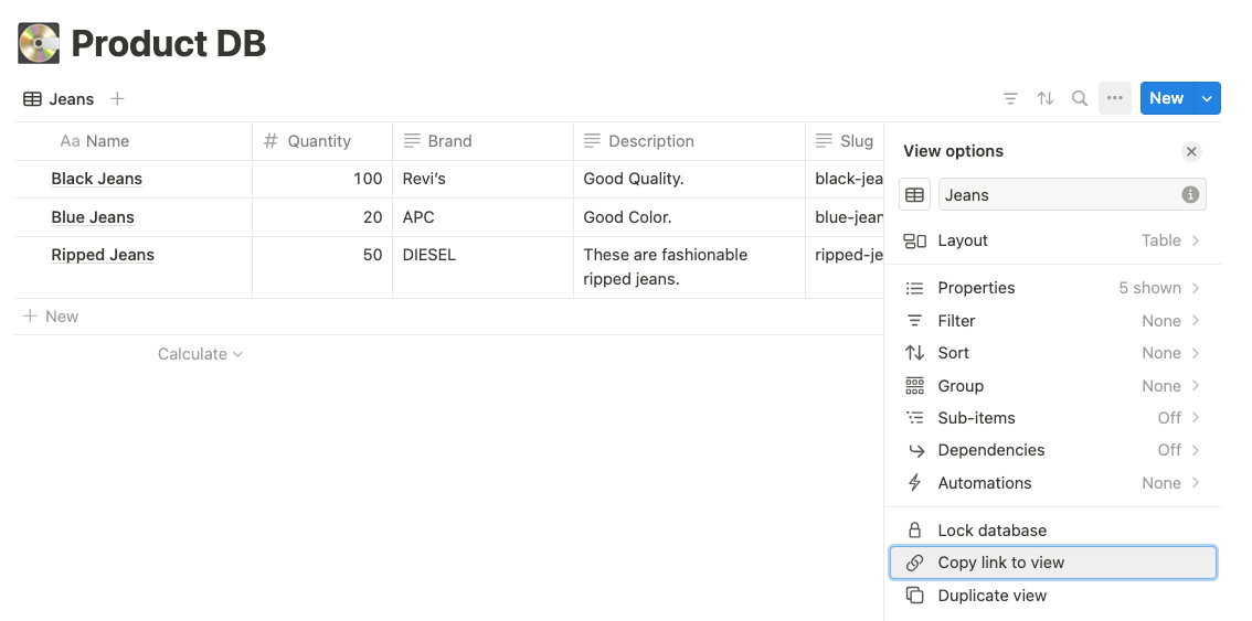 해당 노션 페이지에 table 말고 다른 컨텐츠가 있다면 table - … 메뉴 - Copy link to view로 경로를 입력합니다.