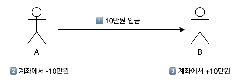 만약 A계좌에서 10만원이 차감되고, 오류가 발생한다면? B계좌는 입금받지 못하고 A계좌에서 출금만 되는 아찔한 상황이 일어날 것이다.