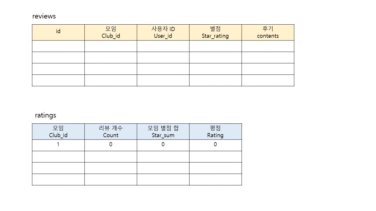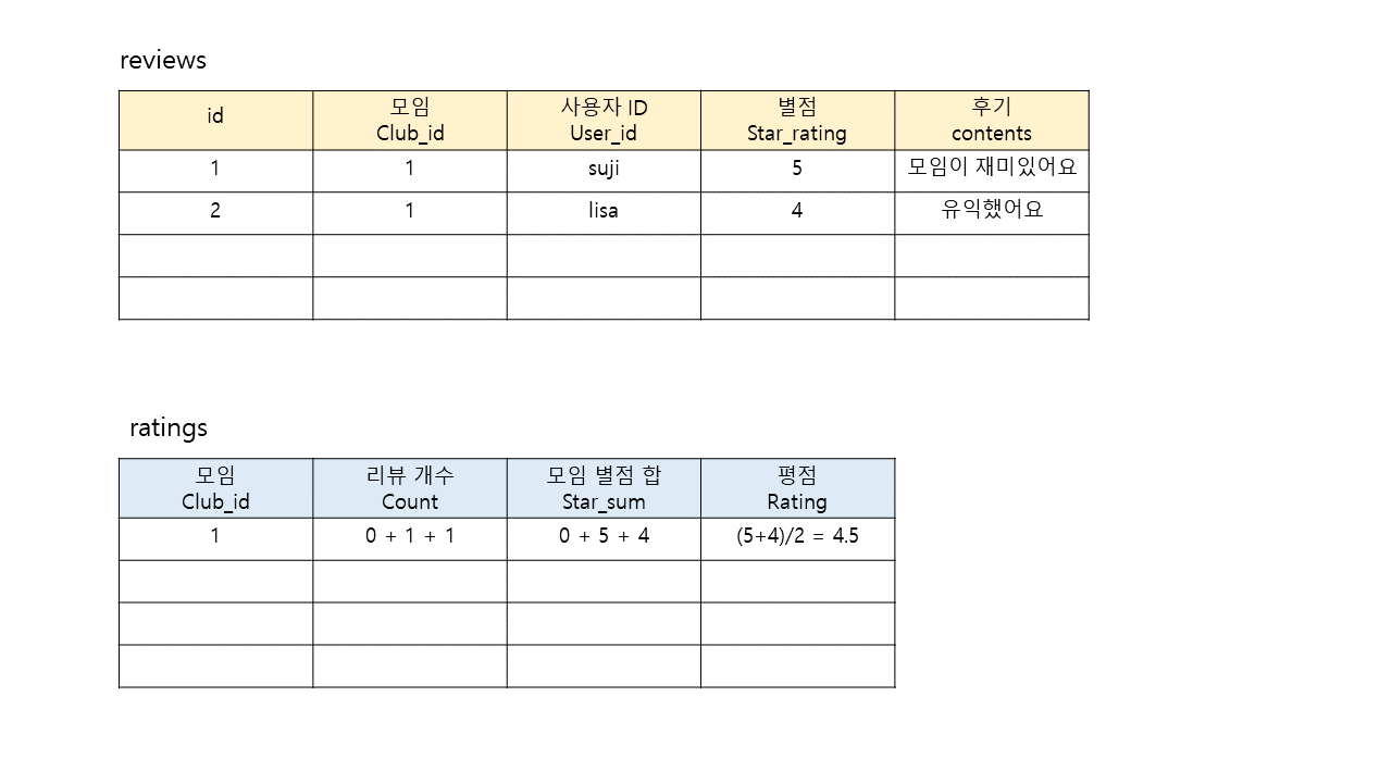 평점을 조회할때마다 해당 모임ID를 찾아서 reviews 테이블에서 검색해야하고 그 값들을 모아 산출해야되는 복잡한 과정이 계속된다