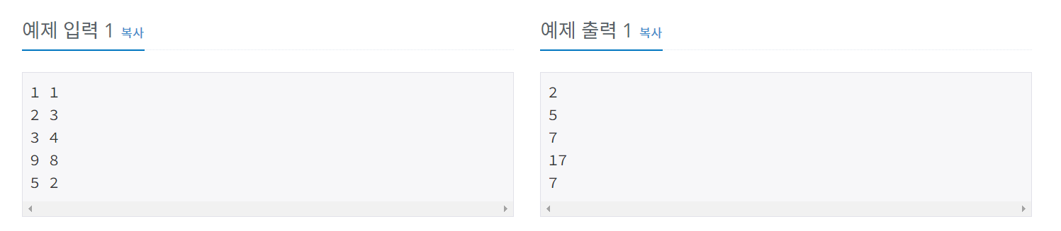 각 테스트 케이스는 한 줄로 이루어져 있으며, 각 줄에 A와 B가 주어진다. (0 < A, B < 10)