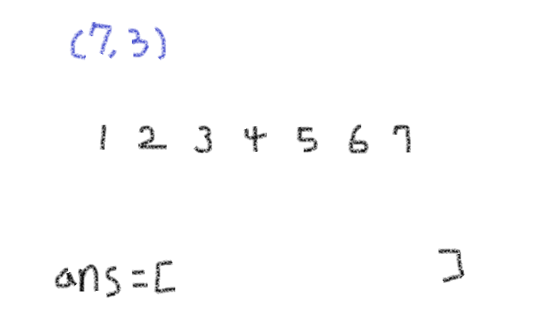 1번부터 N번까지 N명의 사람이 원을 이루면서 앉아있고, 양의 정수 K(≤ N)가 주어진다. 이제 순서대로 K번째 사람을 제거한다. 한 사람이 제거되면 남은 사람들로 이루어진 원을 따라 이 과정을 계속해 나간다. 이 과정은 N명의 사람이 모두 제거될 때까지 계속된다. 원에서 사람들이 제거되는 순서를 (N, K)-요세푸스 순열이라고 한다. 예를 들어 (7, 3)-요세푸스 순열은 <3, 6, 2, 7, 5, 1, 4>이다.