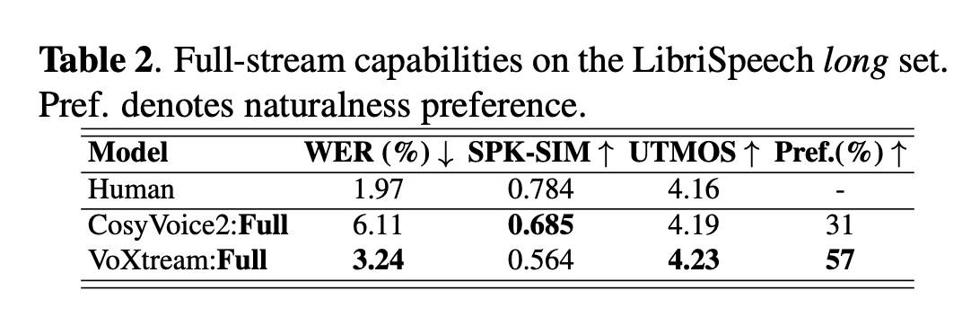 실제로 일부 output streaming 모델은 표면적으로 우수한 객관 지표를 보이기도 하지만, prompt 재합성과 같은 구현상의 이슈(CosyVoice2는 target text가 prompt보다 짧으면 prompt를 다시 합성해버림)로 평가 지표가 왜곡될 수 있으며, 이러한 결과는 fully streaming 설정과 직접 비교하기에는 한계가 있다고 저자들은 주장합니다.