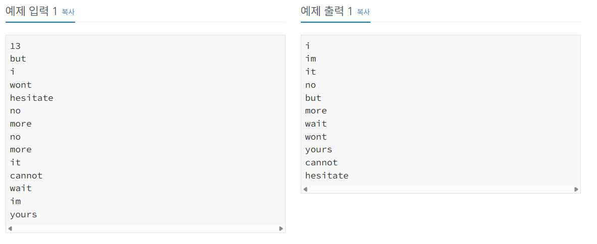 sorted_words = sorted(words, key=lambda x: (len(x), x)) # 길이 순, 길이가 같으면 사전 순 정렬