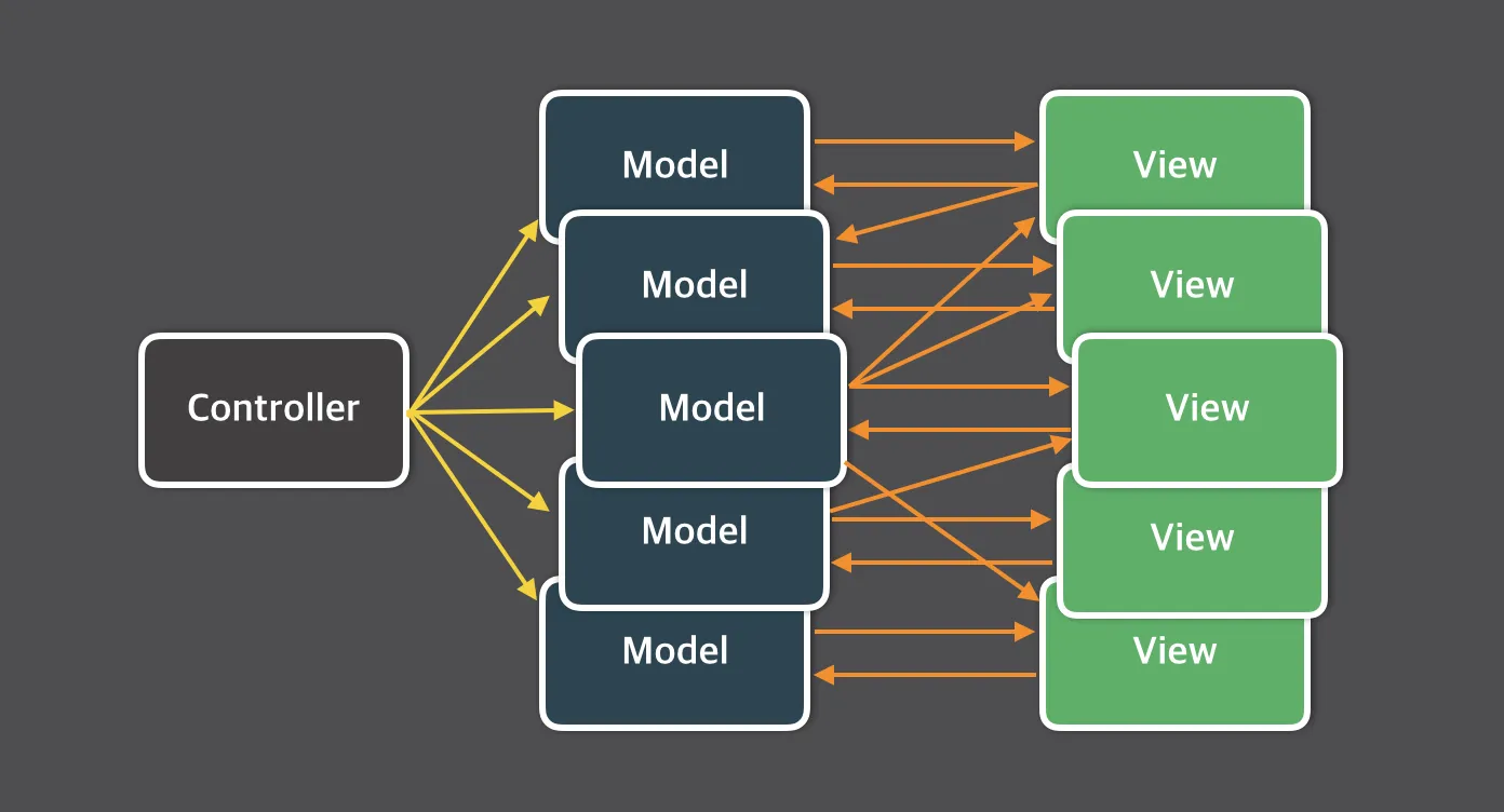 또, 한 View 에서 일어난 상호작용으로, 여러 Model이 변경되거나, 그 반대의 일도 벌어지기에, 코드가 복잡해지는 경향이 있었다.