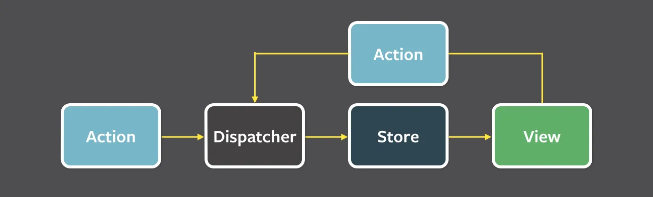 위 그림과 같이, 어떤 Action 이 발생하면, Dispatcher에서 이를 받아와 해석한 후 Store(=Model) 에 저장된 정보에 변경을 가하고, 그 결과가 View로 다시 전달되도록 한다.