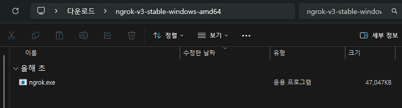 다운로드한 zip 파일을 압축 해제하면 정직하게 ngrok.exe 파일만 있는 것을 볼 수 있다. 해당 exe 파일을 더블클릭해서 cmd 창을 오픈하자.