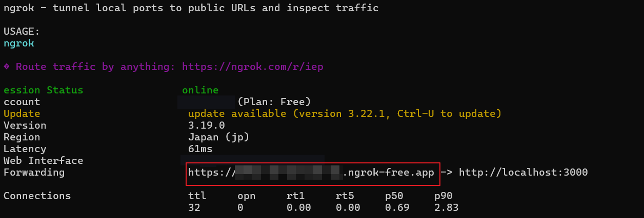 아래와 같이 localhost:3000 주소가 https://~~~.ngrok-free.app 주소로 포워딩된 것을 볼 수 있다.