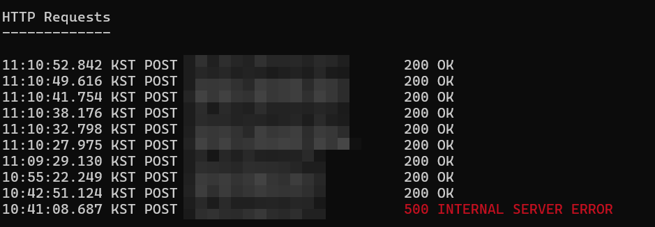 요청이 들어온 기록은 cmd창에 시간과 응답 status code와 함께 로깅되는 것을 볼 수 있다.