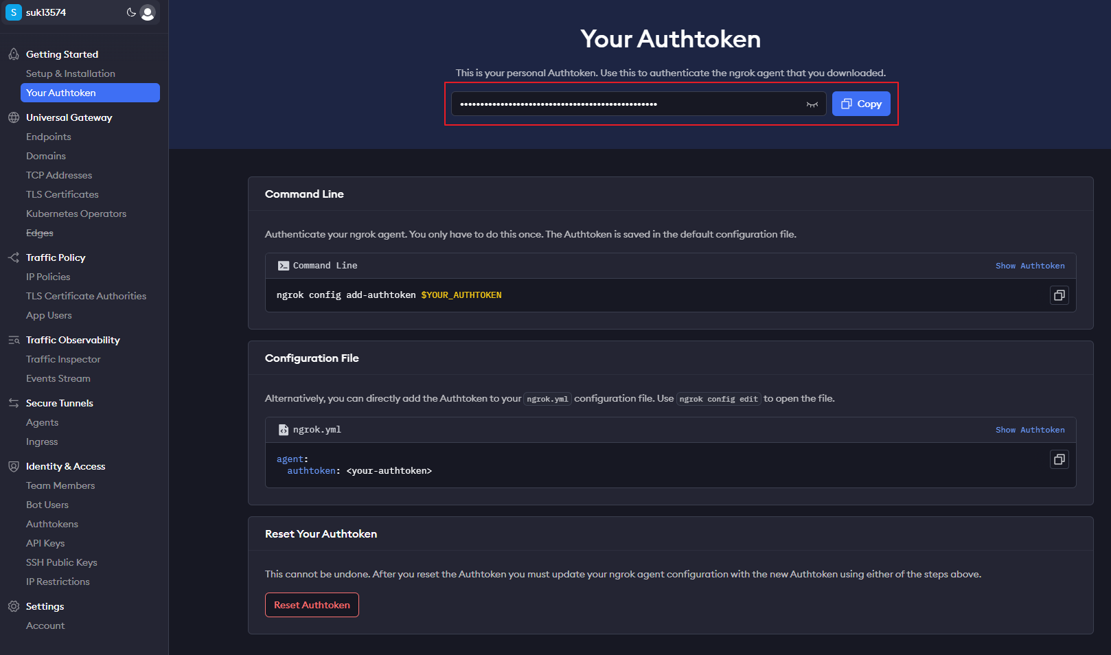 ngrok 회원 가입 후 Getting Started > Your Authtoken에서 토큰을 복사한다.
