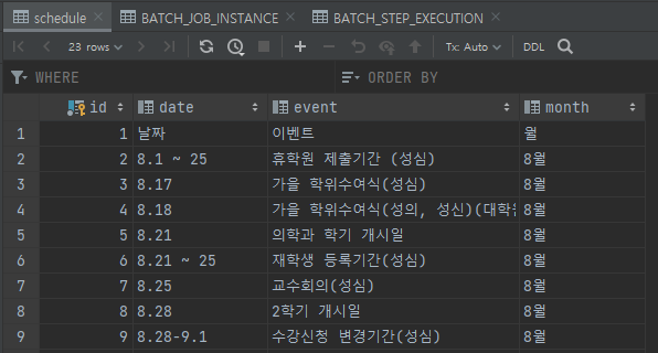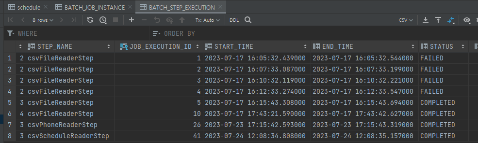 BATCH_STEP_EXECUTION: Step 동작 성공적으로 끝낸 것을 볼 수 있음(COMPLETED)