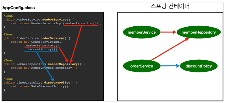 1) 수동 빈 등록 - 직접 의존관계 주입, 설정정보 클래스에 직접 기입