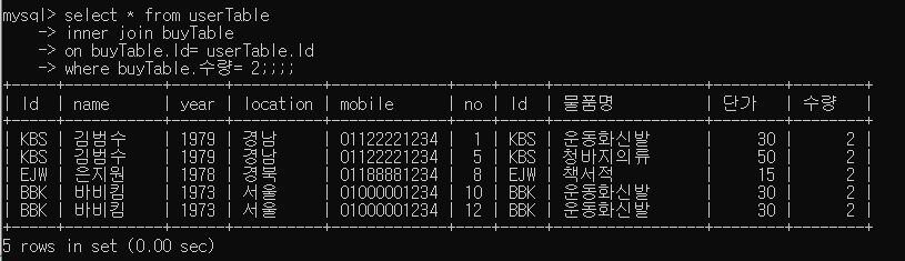 buyTable의 Id가 userTable의 Id와 일치하는 값을 join한 값들 중