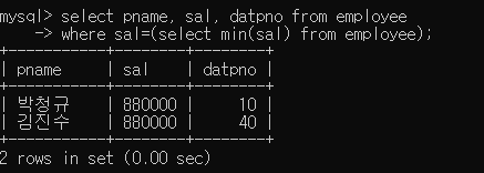 👉 가장 적은 sal을 가지는 사람의 pname, sal, datpno을 출력했다.