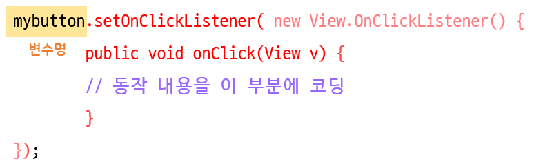 set(설정한다)On(~했을때)Click(클릭)Listener(듣고있다)set(설정한다)On(~했을때)Touch(클릭)Listener(듣고있다)