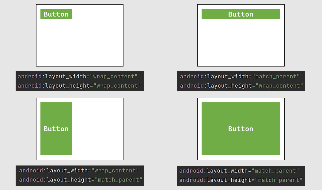 wrap_content : 안에 있는 글자나 이미지가 꼭 맞는 정도로 너비나 높이를 설정match_parent or fill_parent : 안에 있는 글자나 이미지와 상관없이 버튼을 감싸고있는 부모의 너비(레이아웃 등)에 꽉 차는 크기로 맞춤