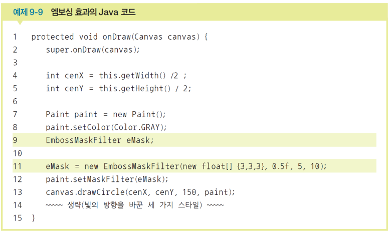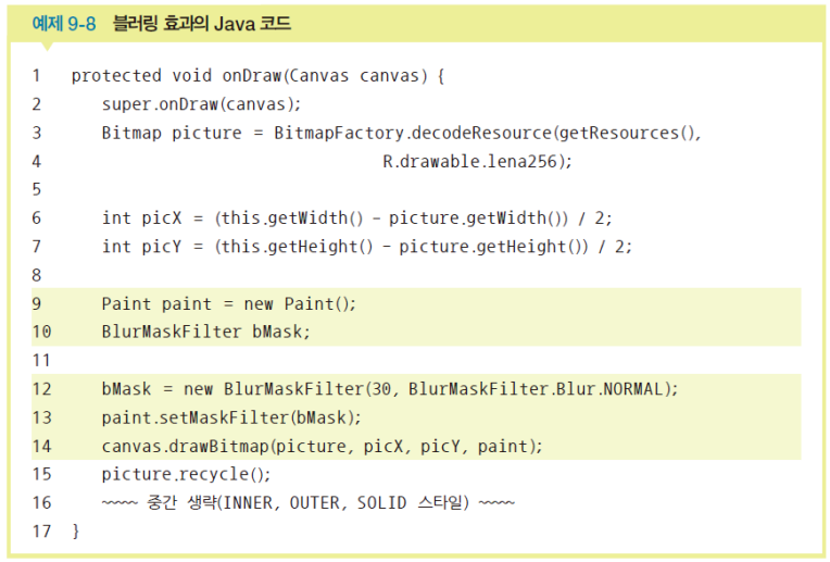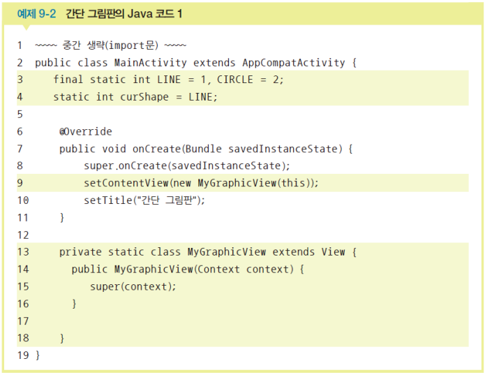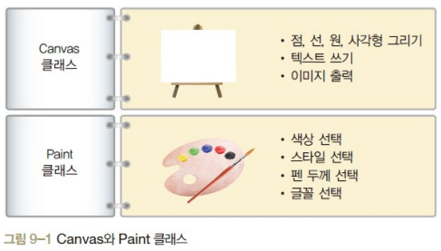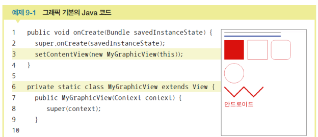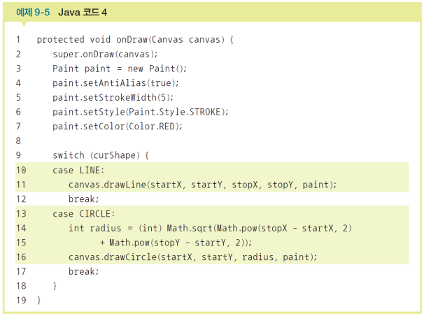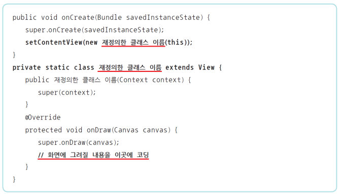 @override부터): 클래스가 생성 or 무효화되면 실행되는 메소드를 정의한다.페인트.setAntiAlias() 메서드는 도형의 끝을 부드럽게 처리해준다. 페인트.setColor()로 도형의 색을 Paint에 저장한다.페인트.setColor()로 지정한 색은 다른 색으로 지정하기 전까지 계속 유지된다. 캔버스.drawline(시작x, 시작y, 끝x, 끝y, 페인트)로 선을 그린다. 페인트.setStrokeWidth()로 그려질 도형 or 글자 외곽선 두께를 설정한다.페인트.setStyle(Paint.Style.FILL)로 도형의 내부를 채운다. 얘도 한 번 설정하면 변경 전까지 계속 유지된다. 페인트.setStyle(Paint.Style.STROKE)로 도형의 내부를 채우지 않는다. 얘도 한 번 설정하면 변경 전까지 계속 유지된다. Rect 객체명 = new Rect(x,y,x1,y2)으로 사각형을 그리기 위해 Rect 객체를 생성하고 4개의 좌표를 미리 만든다. Rect 클래스는 int형을, RectF 클래스는 float형 값을 갖는다.캔버스.drawRect(사각형객체명, 페인트명)으로 사각형을 그린다. 캔버스.drawRoundRect(사각형객체명, 타원의 x축 반지름, 타원의 y축 반지름, 페인트명)으로 사각형의 모서리를 둥글게 처리한다.캔버스.drawCircle(중심x, 중심y, 반지름, 페인트명)으로 원을 그린다.