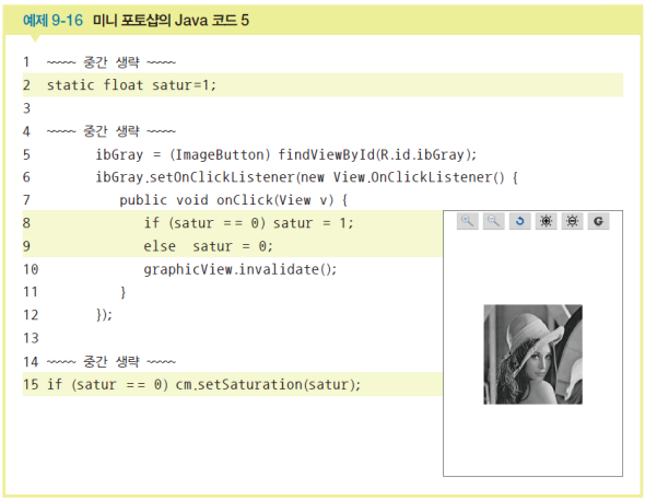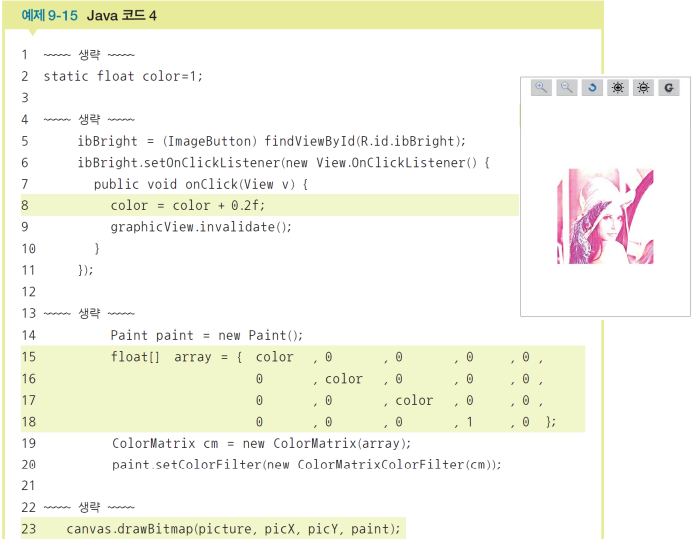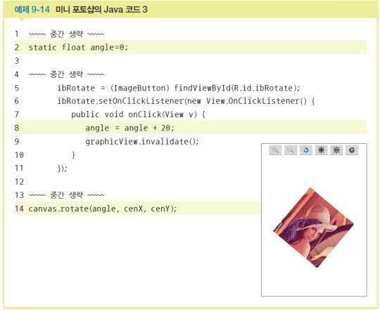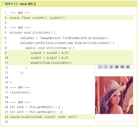 clickIcons() 메소드를 정의하고 확대 이미지버튼의 클릭리스너를 만든다. 확대 아이콘을 클릭할 때마다 축척 전역변수가 0.2씩 증가한다. 확대를 위해서는 onDraw() 메소드를 다시 호출해야 하는데 뷰의 invalidate() 메소드는 onDraw()를 자동으로 호출해준다. 예제9-12의 16행에 코딩한다. clickIcons() 메소드를 호출한다. 예제9-12의 14행에 코딩한다. 축소 아이콘도 비슷하게 코딩한다.