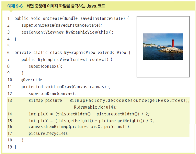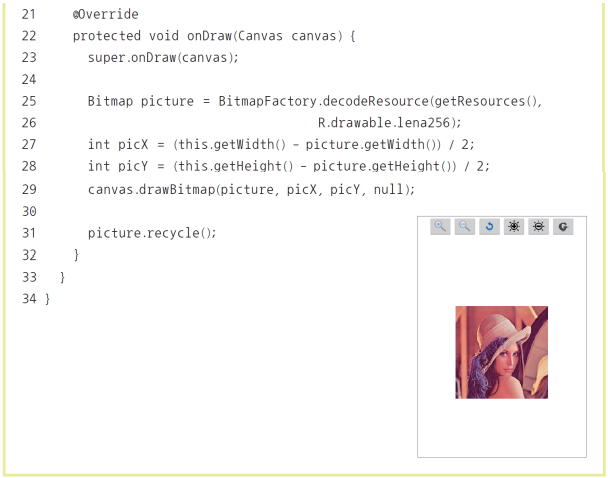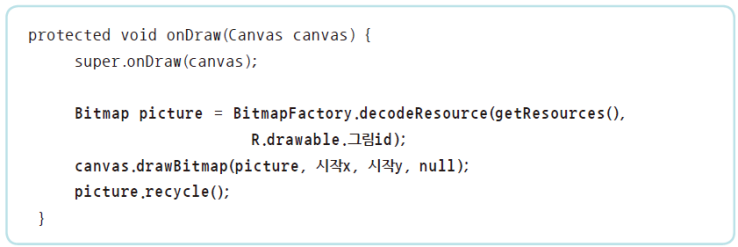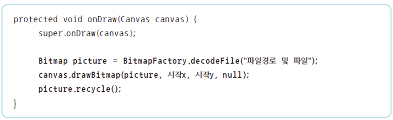 BitmapFactory.decodeResource() 로 리소스 이미지에 접근캔버스.drawBitmap(비트맵이미지, 시작x, 시작y, null) 로 화면에 이미지 출력비트맵이미지.recycle() 로 비트맵 리소스 해제
