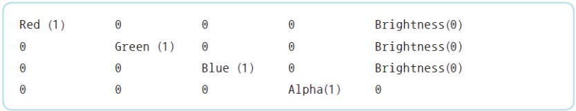 4x5Red, Green, Blue, Alpha의 값은 기본적으로 1이 설정되어 있는데, 이 값을 몇 배로 올리면 색상의 대비(contrast)가 커진다.