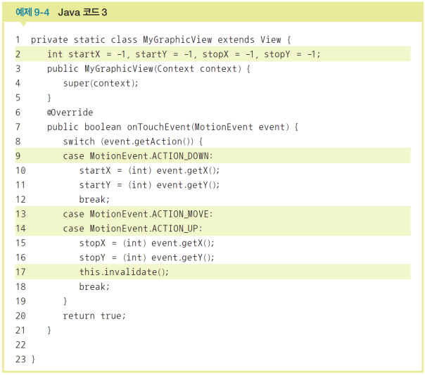 onTouchEvent( ) 메소드 자동 완성 후 추가될 부분 작성onTouchEvent() 메소드가 더이상 실행되지 않는다. 즉, 시작점(startX,startY)과 끝점(stopX,stopY)이 결정되는 것이다.invalidate()를 호출하면 화면이 무효화되고 onDraw() 메서드를 자동으로 실행한다.