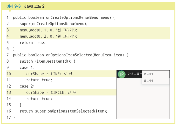 선 그리기, 원 그리기 옵션 메뉴 만들기onCreateOptionsMenu( ) 와 onOptionsItemSelected( ) 메소드 자동 완성
