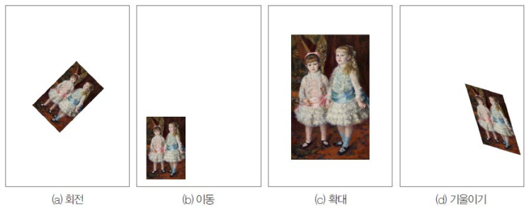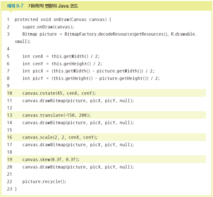 this.getWidth()는 현재 뷰(MyGraphicView)의 너비를 구한다. 현재 뷰의 너비에서 이미지의 너비를 뺀 다음 2로 나눈 위치를 시작점으로 하여 이미지를 출력한다. 결국 화면 중앙에 이미지가 출력된다.rotate( )scale( )translate( )skew( )