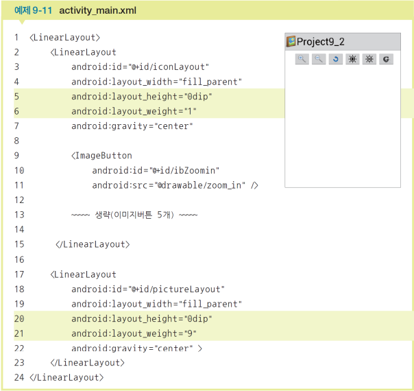 - 두 리니어레이아웃의 layout_weight는 1:9 정도로 설정