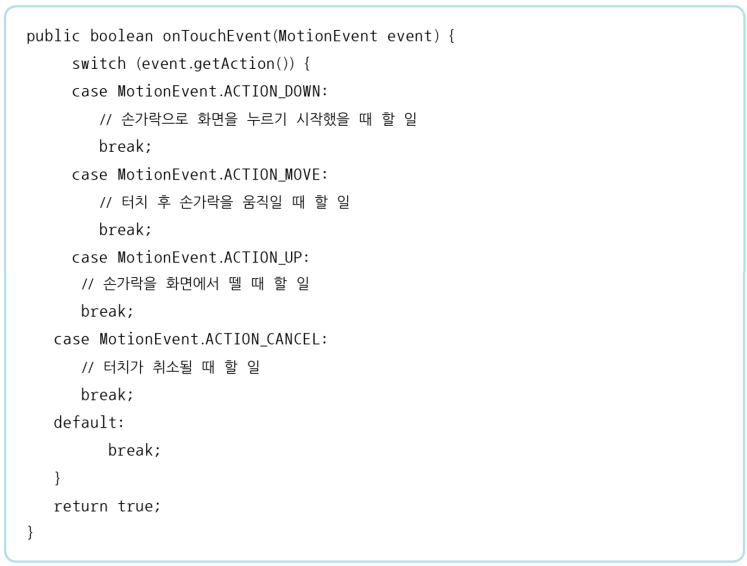 .getAction() 로 터치한 동작을 얻은 후, 각 터치를 switch~case문으로 구분한다.
