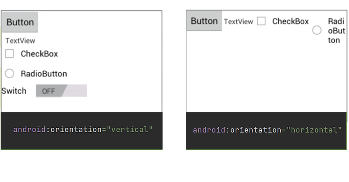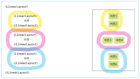 orientation : 내부 위젯의 수직/수평 방향을 설정gravity : 내부 위젯의 정렬 방향을 좌측, 우측, 중앙으로 설정padding : 내부 위젯의 여백을 설정layout_weight : 레이아웃이 전체 화면에서 차지하는 공간의 가중값 baselineAligned : 내부에 배치할 위젯을 보기 좋게 정렬