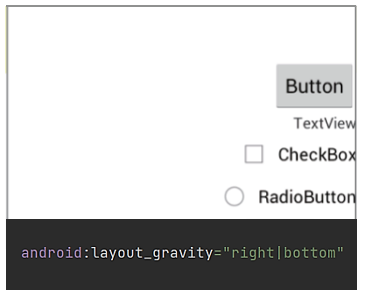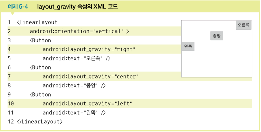layout_gravity: 자신의 위치를 부모(주로 레이아웃)의 어디에 배치할 지 결정, 주로 위젯에 지정gravity: 자신에게 포함된 자식(주로 위젯)을 어디에 배치할 지 결정, 주로 레이아웃에 지정