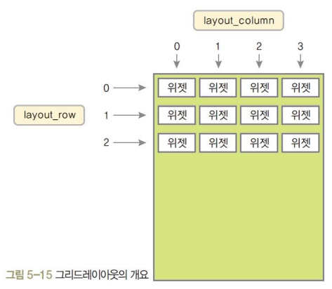 <GridLayout/> 자체에 자주 사용되는 속성rowCount : 행 개수columnCount : 열의 수orientation : 그리드를 수평 방향을 우선할지, 수직 방향을 우선할지를 결정layout_row : 자신이 위치할 행 번호 (0번부터 시작)layout_column : 자신이 위치할 열 번호 (0번부터 시작)layout_rowSpan : 행을 지정된 수만큼 확장layout_columnSpan : 열을 지정된 수만큼 확장layout_gravity : 주로 fill, fill_vertical, fill_horizontal 등으로 지정 행 또는 열 확장하여 위젯을 확장된 셀에 꽉 채우는 효과를 냄