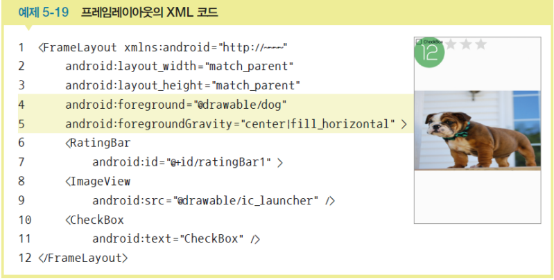 <FrameLayout/>에서 가끔 사용하는 속성foreground : 프레임레이아웃의 전경 이미지를 지정foregroundGravity : 전경 이미지의 위치를 지정