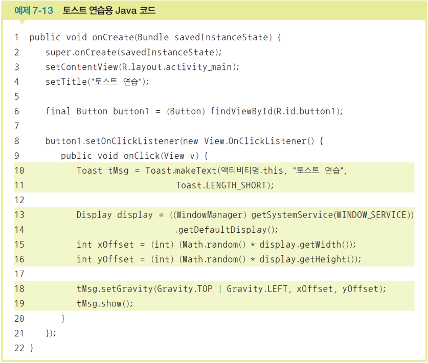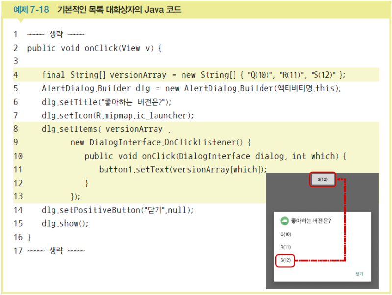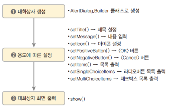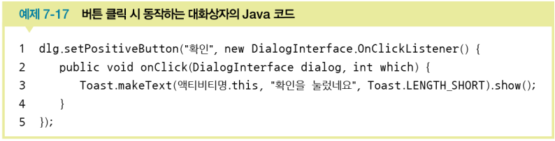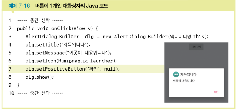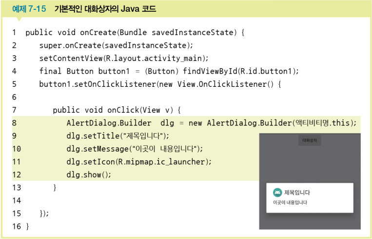 - 8행: AlertDialog.Builder 클래스를 사용해 대화상자를 생성한다.