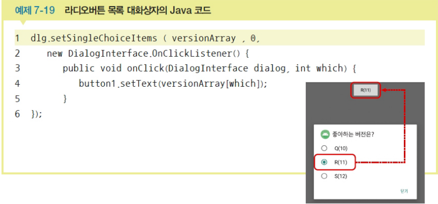 setSingleChoiceItems(문자열 배열, 초기 선택 인덱스, 리스너)