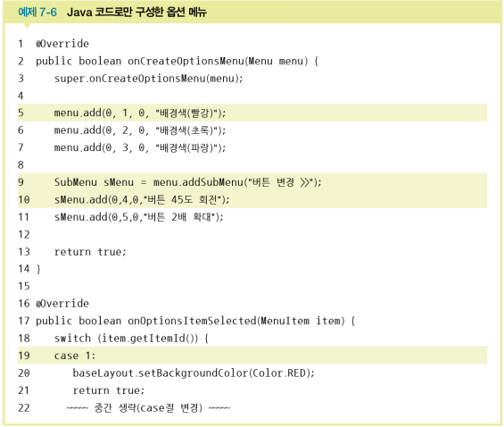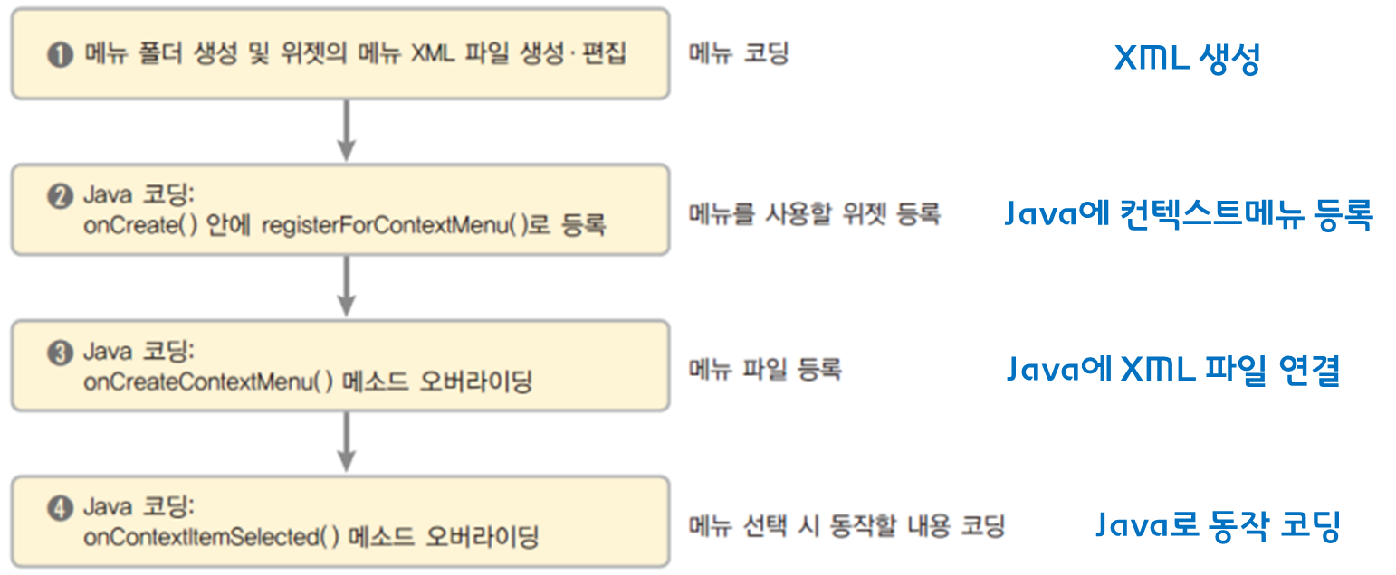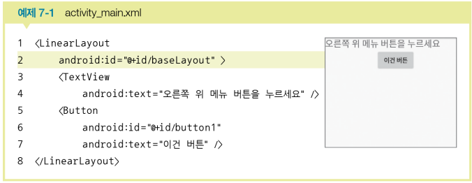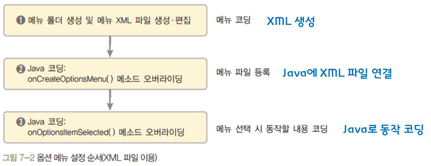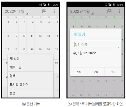- 2가지 종류: 옵션 메뉴, 컨텍스트 메뉴