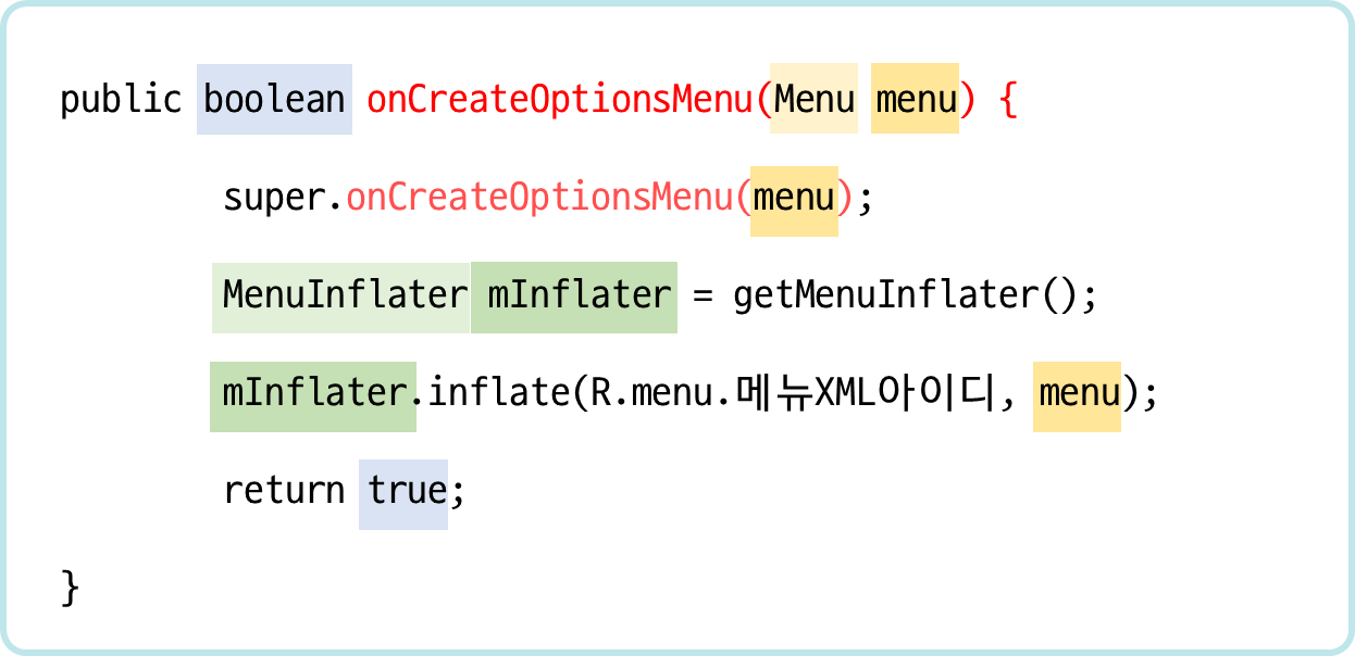 - onCreateOptionsMenu( ) 메소드 기본 형식