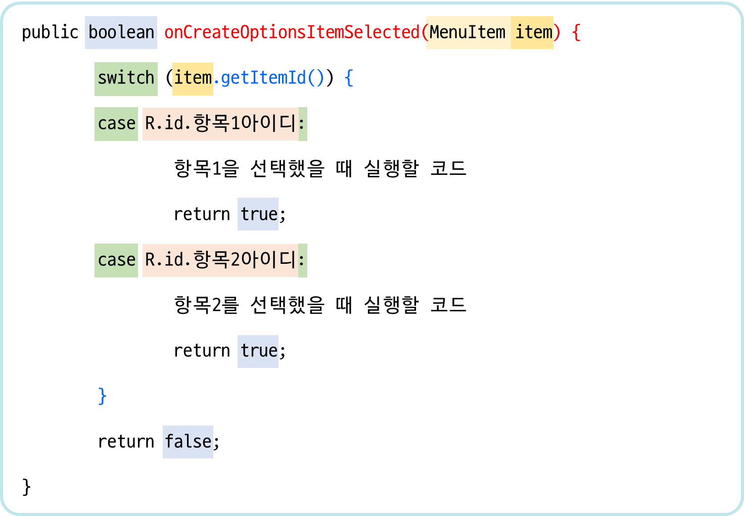 - onOptionsItemSelected( ) 메소드 기본 형식