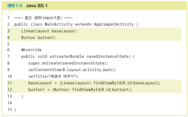 - 11~12행: 메인함수 onCreate() 안에서 위젯 변수 2개에 위젯을 대입한다.
