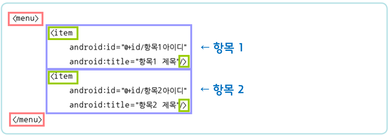 - 3~6행: 메뉴 항목을 1개 추가한다. id는 Java 코드에서 접근할 때 사용하며, 타이틀은 화면에 보이는 제목이다.