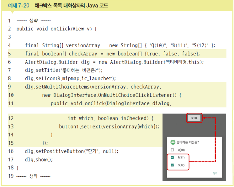 10행의 리스너는 setMultiChoiceClickLister()를 사용한다.