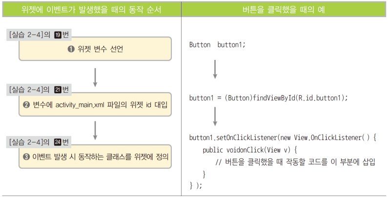 MainActivity.java : 화면에서 할 일을 프로그래밍 + activity_main.xml 파일에 포함된 위젯의 접근 방법 & 위젯의 이벤트 발생 시 작동하는 코드