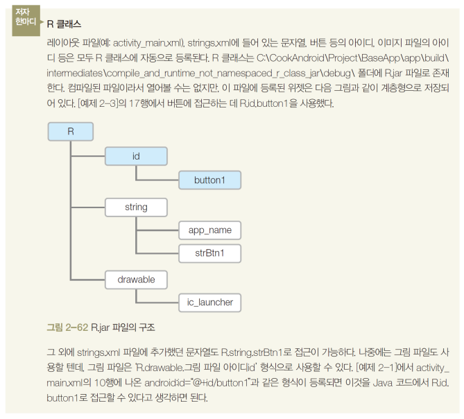 레이아웃 파일, strings.xml에 들어있는 문자열, 버튼의 id, 이미지 파일의 아이디 등은 모두 R 클래스에 자동으로 등록된다.