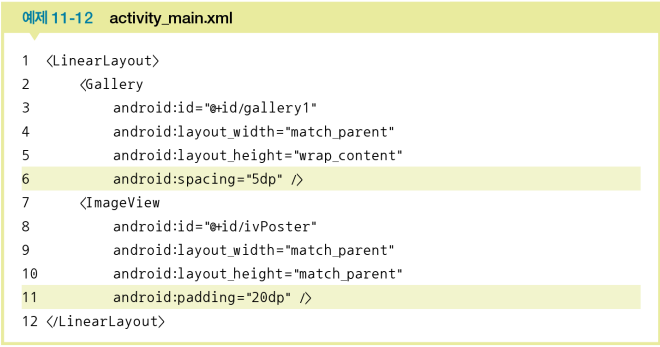 <Gallery />를 정의한다. spacing="5dp"는 갤러리에 있는 이미지 간에 여백을 준다.