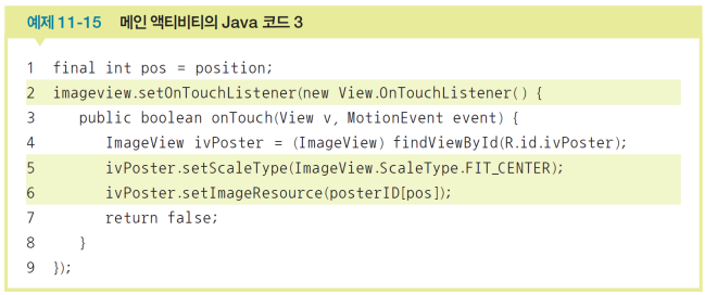 .setScaleType(ImageView.ScaleType.FIT_CENTER)로 이미지뷰를 각 그리드뷰 칸의 중앙에 배치한다..setImageResource()로 이미지뷰에 영화포스터 1개를 적용한다.