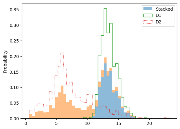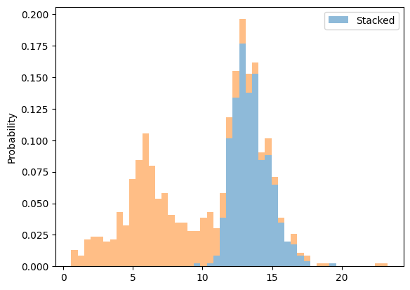 plt.hist([d1, d2], bins=bins, label="Stacked", density=True, histtype="barstacked", alpha=0.5)