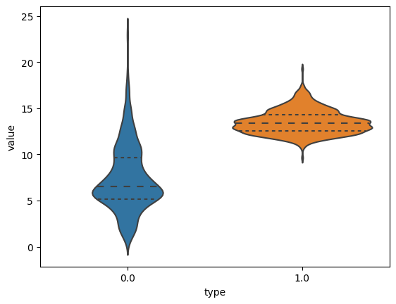 sb.violinplot(x="type", y="value", data=dataset, inner="quartile", bw=0.2)