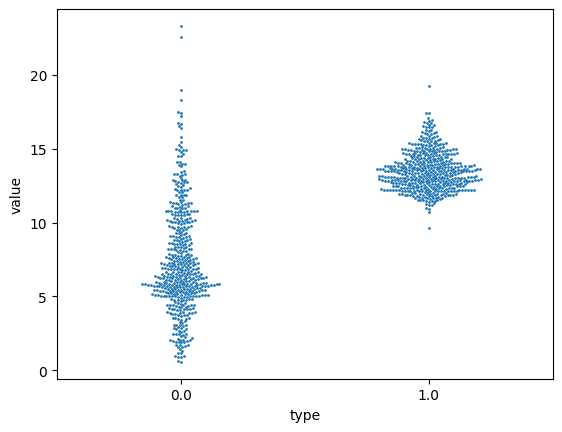 sb.swarmplot(x="type", y="value", data=dataset, size=2)