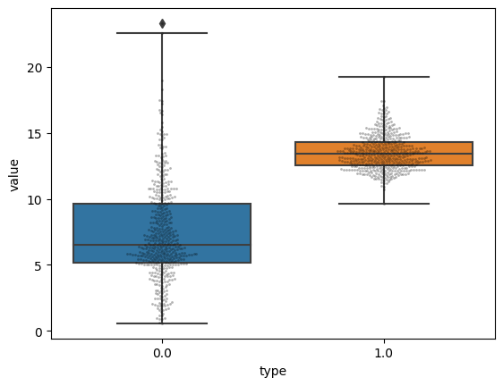 sb.swarmplot(x="type", y="value", data=dataset, size=2, color="k", alpha=0.3)