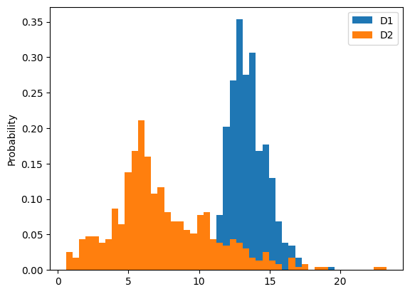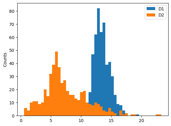 bins = np.linspace(min(d1.min(), d2.min()), max(d1.max(), d2.max()), 50)