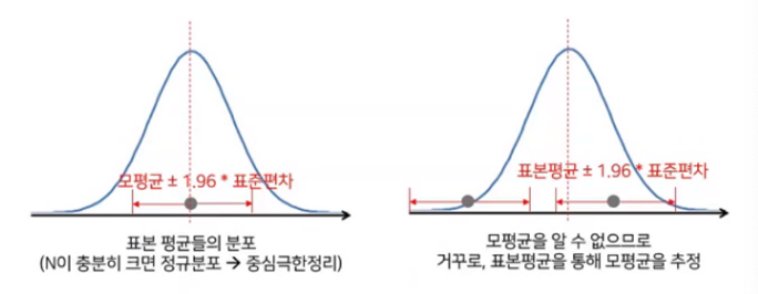 - 95% 신뢰구간 -> 반복적으로 표본 추출을 100회 했을때 모평균을 포함한 신뢰구간이 95개 나올 수 있음을 의미
